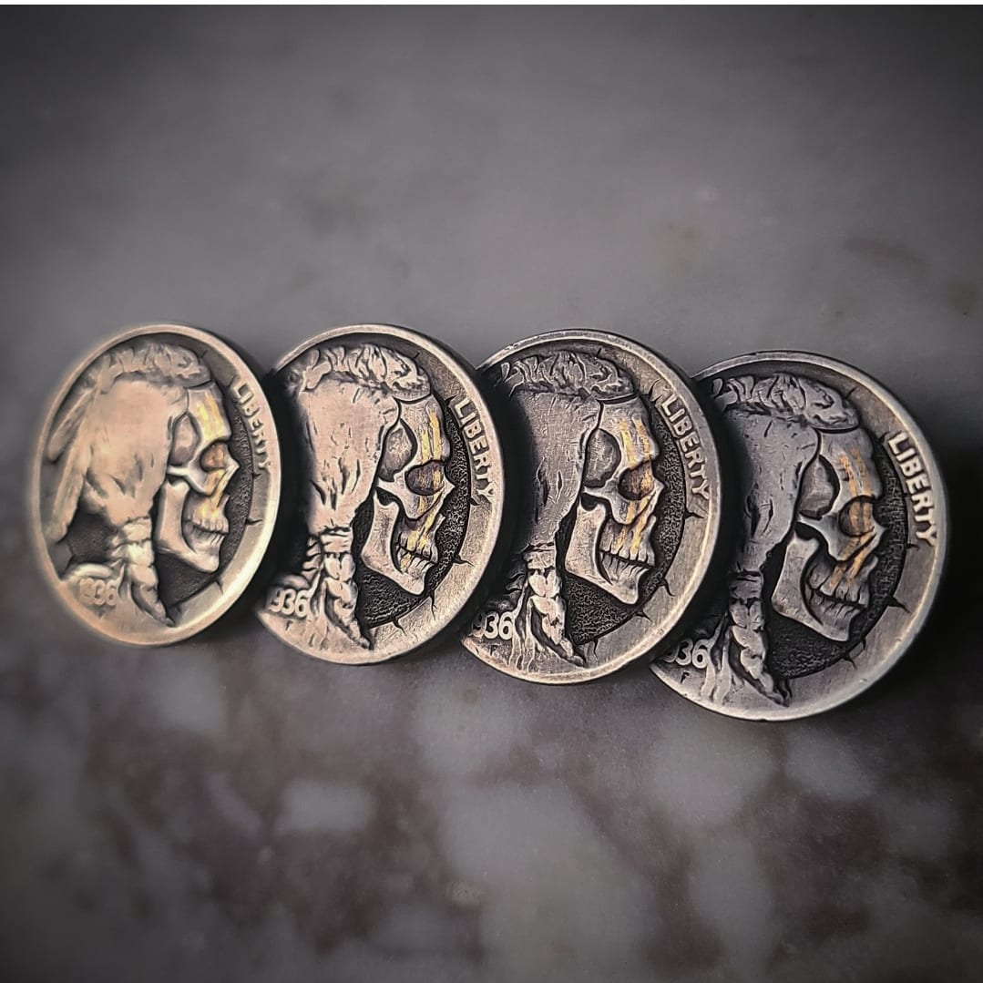 This is the signature skull on a buffalo nickel. U.S minted. All Items are hand engraved and products will be similar as pictured.